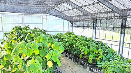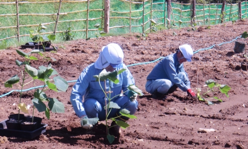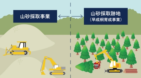 当社では山砂採取跡地の有効活用を進めています。採取跡地は、森林法に則り適切な緑化を行うことで元の森林に復元しますが、この採取跡地にて「早成桐育成事業」による跡地有効活用、新規事業展開に取り組み、山砂採取事業との併業することによって事業継続と雇用の確保を図り、地域社会に貢献してまいります。早成桐はCO2を杉の5〜10倍も吸収する特性を有しているといわれており、単なる森林復元のみならずカーボンニュートラル及び地球温暖化対策にも貢献いたします。 |