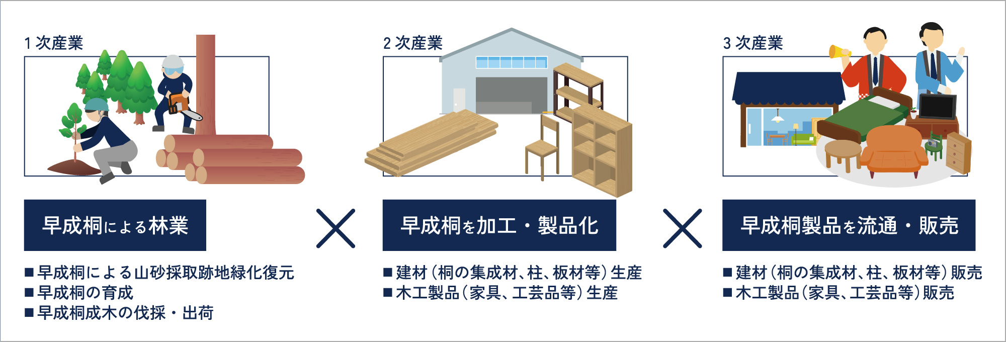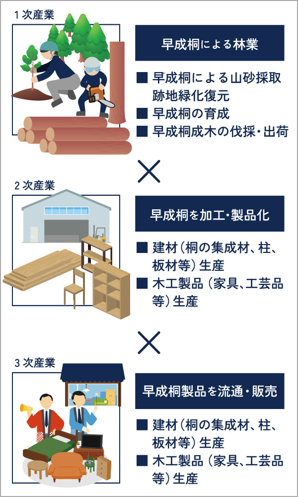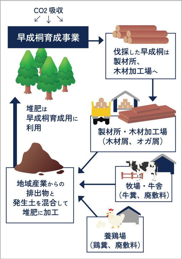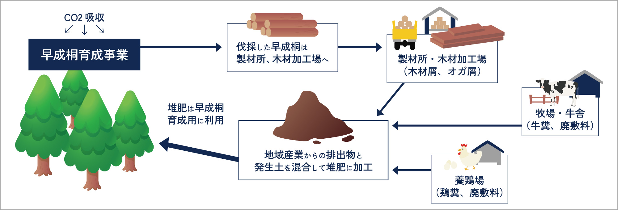 山砂採取跡地における早成桐育成にあたっては、跡地の土壌改良、改質が必須です。地域産業である農林畜産業等から発生する排出物(木材屑、牛糞、鶏糞、敷料等)と混合し堆肥に加工したものを早成桐育成の土壌改良、改質に用いることで排出物の有効活用と速やかな森林復元を果たし、成木となった早成桐は伐採し地元の製材所・木材加工所へ供給することで資源の循環を果たします。将来的には1次産業である早成桐による林業、2次産業として伐採した早成桐の製材・加工・製品化し3次産業として早成桐製品の流通・販売を行い、早成桐育成事業による資源循環と6次産業化を目指します。